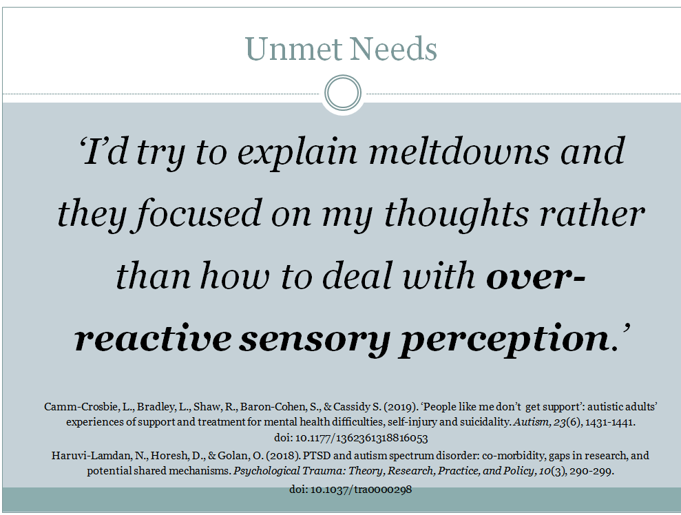 And then when we try to explain how we’re actually feeling, no one is actually listening.  This is a quote from a participant in the first research article here, when talking with a therapist. The therapist expected her to react in the same way as a neurotypical person, even knowing that she was autistic.  The therapist could not step outside of their own experience in order to empathise with their patient’s experience.  So who has theory of mind now?