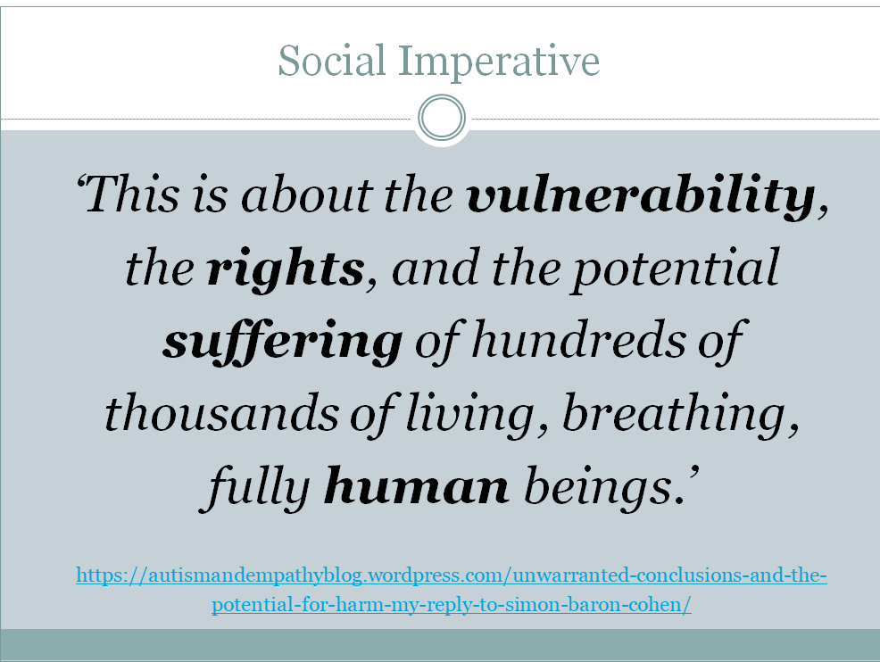 He is also responsible for the ‘extreme male brain’ hypothesis, deciding that systemising is a biologically based male trait and empathising is a biologically based female trait, which is still, dangerously, impacting on the diagnosis of women with autism.  Because if women are biologically programmed towards empathy, which autistic people are deficient in, then how can women be autistic?