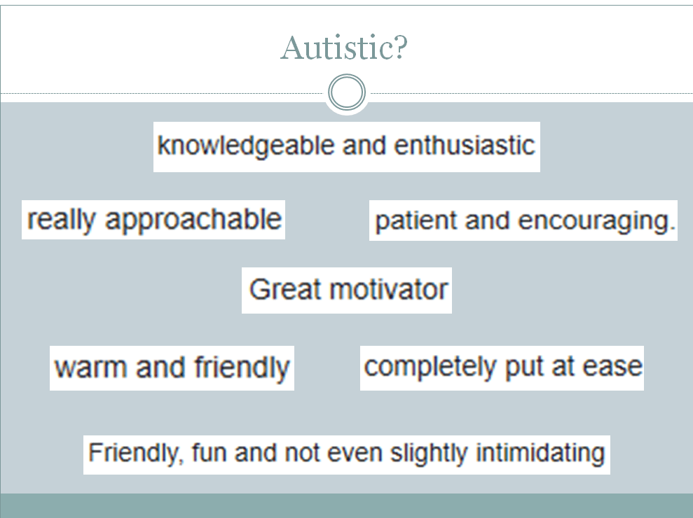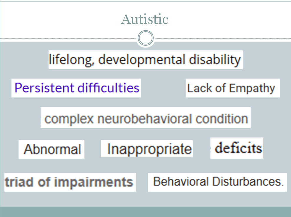 I’ve been doing a lot of research in preparation for this talk.  And these are the words that I’ve come across when reading about autism.  These are the words that you’ll have come across when reading about autism.  These are the words that professionals use to define autism to the general public.