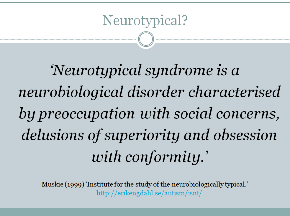 This was written by an autistic woman, she has a website devoted to the study of the neurobiologically typical, including a diagnostic scale if you’d like to measure your neurotypical traits.  In her website the world is turned upside down with autism the prevailing social construct and NTs (neurotypicals) the poor, pitied unfortunate.  Now this illustrates quite nicely not only the autistic capacity for sarcasm, but also the absurdity and malleability of accepted social structure.