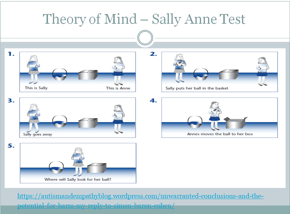 This is called a false belief test and has been used, particularly by Simon Baron-Cohen, a supposed ‘specialist’ in autism research, to ‘prove’ that autistic people do not have theory of mind – theory of mind is the ability to understand that other people have their own thoughts, values and beliefs.  Autistic people will often say that Sally will look in the box, rather than the basket, for her ball.