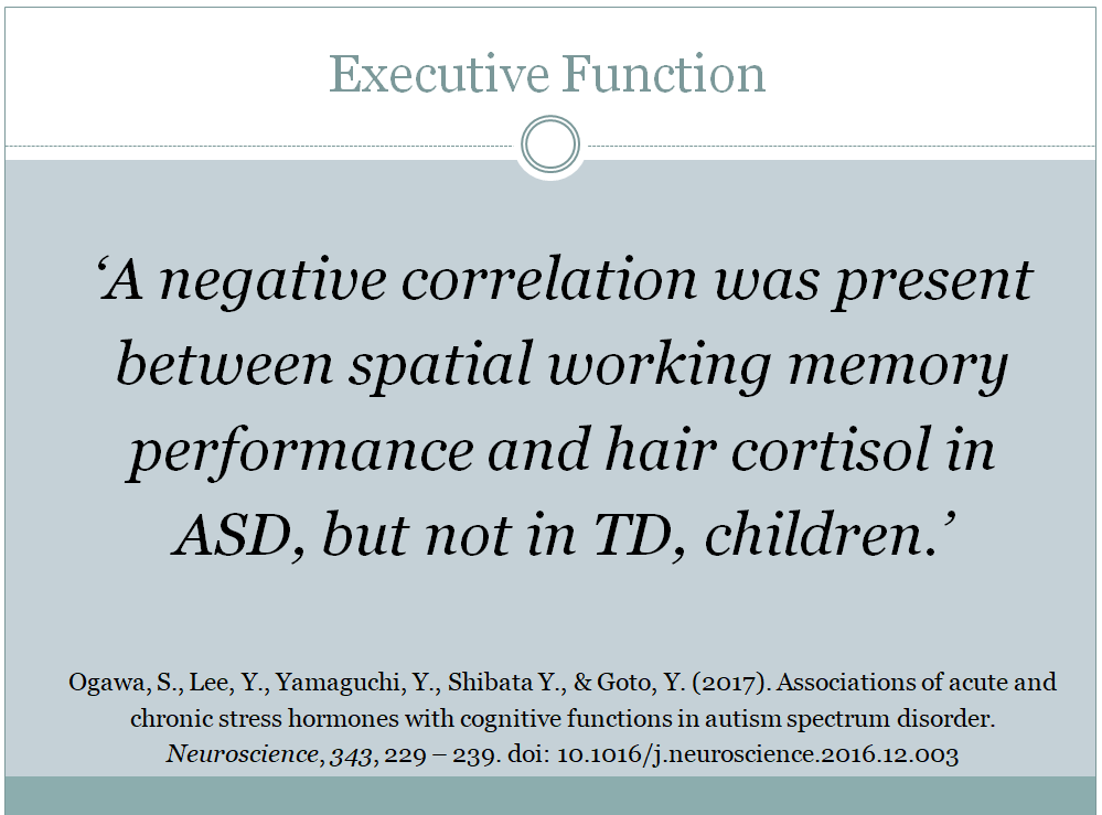 Ogawa et al., studied chronic stress in children with and without autism.  ASD – autism spectrum disorder and TD – typically developing.  They used strands of hair to test for cortisol, stress levels, as hair will show a long term impact, not affected by acute situations.  They found that children with autism had higher levels of chronic stress than those without, and that that chronic stress impacted on the autistic children’s spatial working memory, an aspect of executive function.