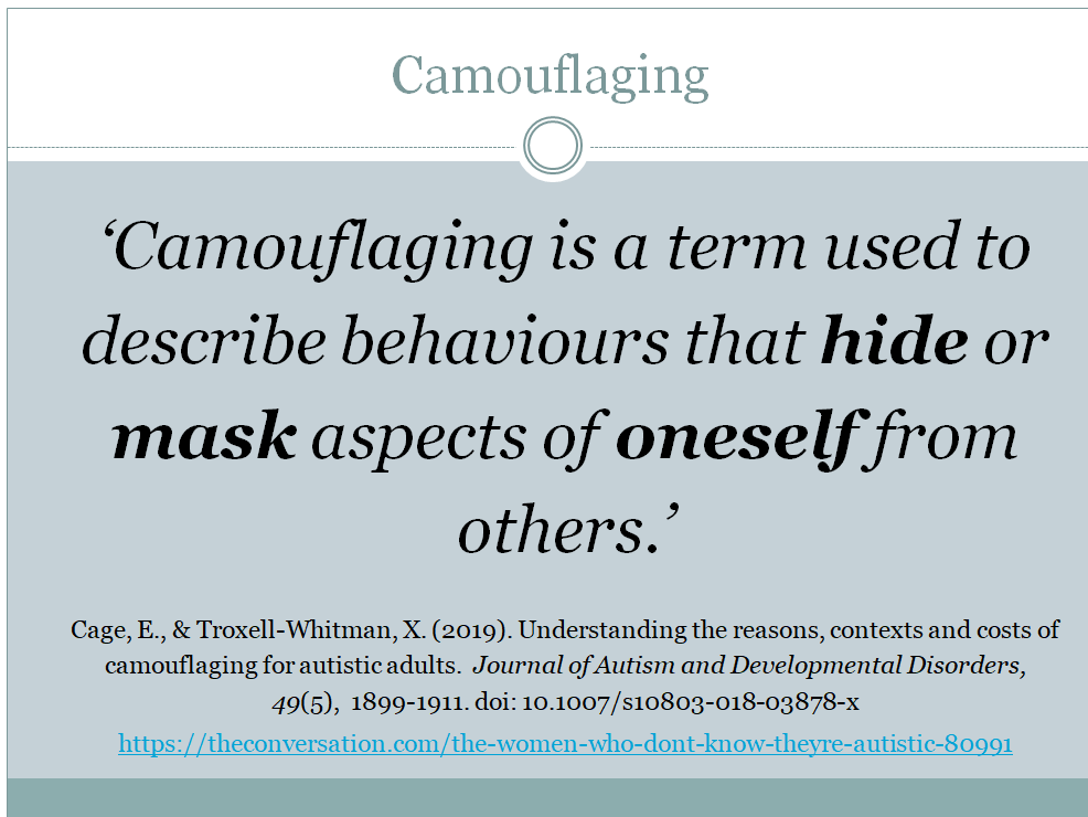 In order to engage in camouflaging, you must have insight into your own behaviours, how these may be negatively perceived by others, and then have a strong motivation to adapt your social behaviour to be accepted.